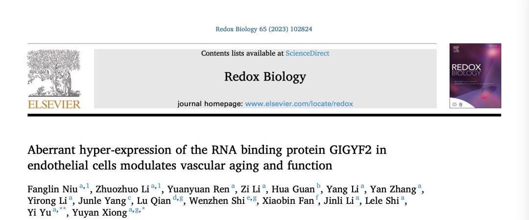 近日,西北大学生命科学与医学院熊裕焱教授团队在GIGYF2在血管内皮细胞衰老中的生物功能及其调控机制的研究中取得了新进展,研究结果以研究长文(Article)形式发表在《Redox Biology》杂志上,题名为“Aberrant hyper-expression of the RNA binding protein GIGYF2 in endothelial cells modulates vascular aging and function”。