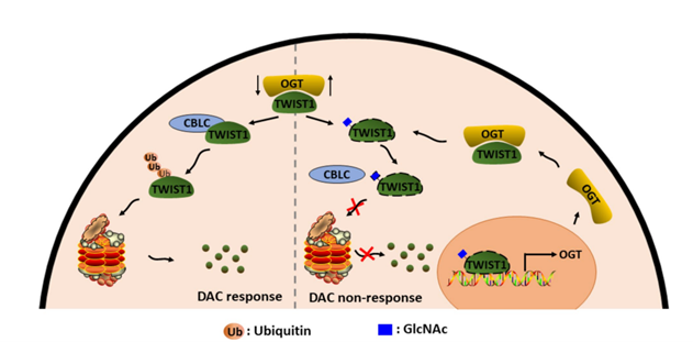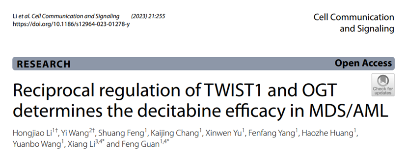 另一方面,该研究从蛋白质翻译后修饰的角度阐述了TWIST1在MDS中表达异常升高的机制,发现转录因子TWIST1蛋白上的31位丝氨酸上存在O-GlcNAc修饰,并且该修饰可以抑制TWIST1与E3泛素连接酶CBLC的互作,进而抑制TWIST1发生泛素化修饰,稳定TWIST1的表达,通过染色质共沉淀和双荧光素酶报告基因实验,发现TWIST1可以结合OGT启动子区,激活OGT转录。该研究成果以“Reciprocal regulation of TWIST1 and OGT determines the decitabine efficacy in MDS/AML”为题发表在Cell Communication and Signaling期刊,西北大学生科院博士后李鸿姣和陕西省人民医院血液科王一主任为共同第一作者,李想教授和关锋教授为共同通讯作者。