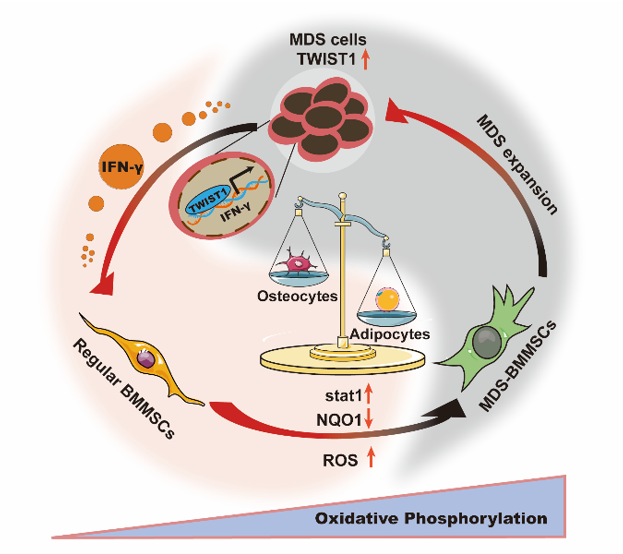 骨髓来源的间充质干细胞(Bone marrow mesenchymal stem cells, BMMSCs)是骨髓微环境的重要组成部分,具有分化为成骨细胞和脂肪细胞的潜力,并且与骨髓增生异常综合征(Myelodysplastic syndromes, MDS)和急性髓系白血病(Acute myeloid leukemia, AML)等髓系恶性肿瘤的疾病进展密切相关。而在MDS及AML中通常伴随着BMMSCs分化能力的改变,而具体机制还尚不清楚。