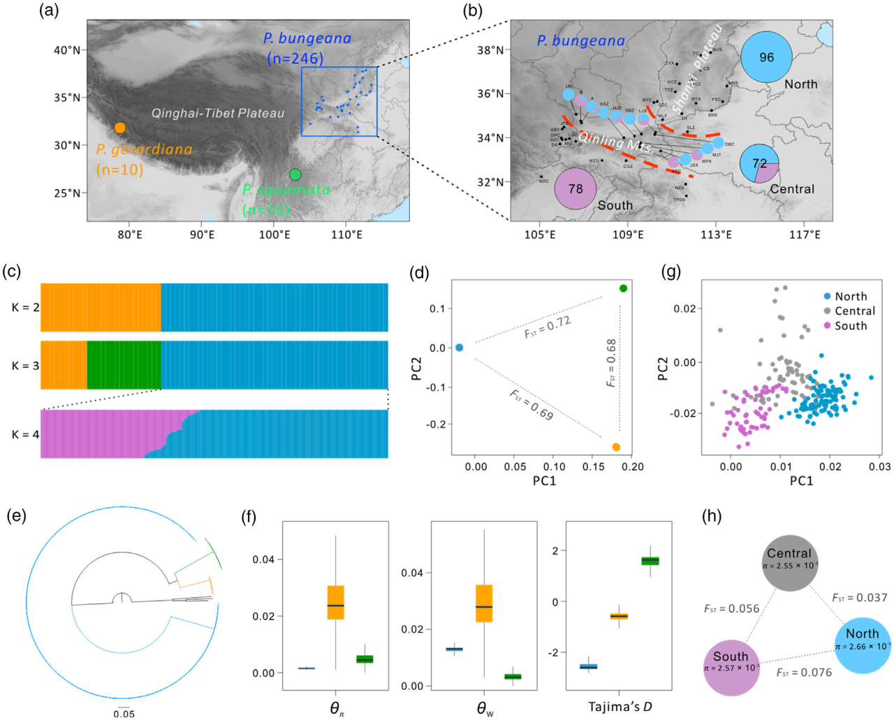 西北大学为第一作者单位和通讯作者单位,西北大学和广西师范大学寇一翾博士、西北大学已毕业刘米利博士和巴塞罗那植物研究所Jordi Lopez-Pujol博士为论文的并列第一作者,李忠虎教授为论文的通讯作者,课题组博士研究生张祺婧、广西师范大学张志勇教授参与了这项研究工作。该研究工作得到了国家自然科学基金项目(31970359,31901222)、陕西基础科学(化学、生物学)研究院重点项目(23JHZ009,22JHZ005)以及陕西省重点研发计划(2022ZDLSF06-02)等项目的支持。