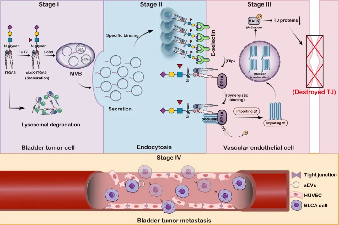 该研究发现,肌层浸润性膀胱癌细胞来源的sEVs上高水平表达sLeX修饰。高sLeX糖基化修饰能够提高血管内皮细胞对肿瘤细胞sEVs的摄取效率,从而介导sEVs对血管通透性的调控过程。此外,sLeX糖基化修饰还能维持ITGA3蛋白的稳定性,使其通过sEVs进入血管内皮细胞,协同调控PP1A与闭合蛋白occludin的相互作用,促进occludin在Ser/Thr残基上的去磷酸化,随后通过importin-α1介导的核易位途径抑制细胞膜上occludin的表达,破坏血管通透性并诱导肿瘤血管新生,从而推动膀胱癌的恶性发展进程。