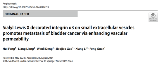 近日,437437必赢国际网址关锋教授团队在唾液酸化路易斯X抗原(Sialyl Lewis X, sLeX)修饰膀胱癌来源的小细胞外囊泡破坏血管完整性的研究中取得了新进展,该研究成果以研究长文(Article)形式发表在Angiogenesis期刊,题名为“Sialyl Lewis X decorated integrin α3 on small extracellular vesicles promotes metastasis of bladder cancer via enhancing vascular permeability”。