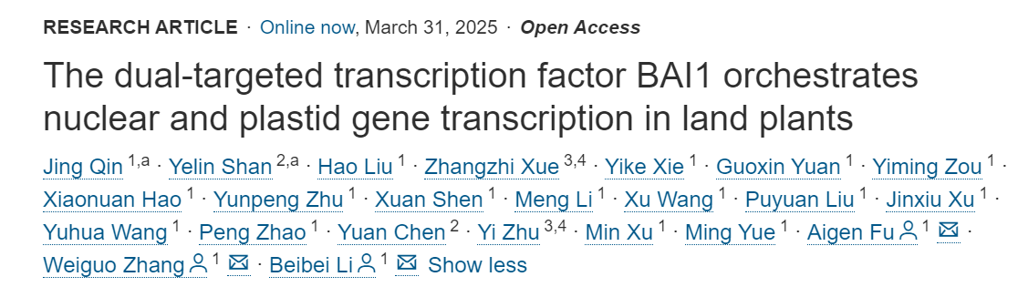 近日,437437必赢国际网址付爱根/李贝贝/张卫国团队在Molecular Plant(5-year IF:21.4)发表了题为“The dual-targeted transcription factor BAI1 orchestrates nuclear and plastid gene transcription in land plants”的研究论文。该研究揭示了一种在陆地植物中保守的分子调控机制:细胞核-质体双靶向转录因子BAI1,能够同时精确调控细胞核和质体基因组的转录过程。