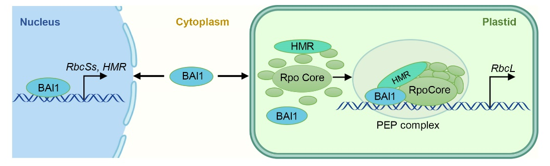 研究团队在拟南芥中发现了一个未被报道的C2H2型锌指转录因子,该因子同时定位于细胞核和质体中。由于缺失突变体表现出子叶白化和幼苗致死等表型,研究者将其命名为BAI1(取自中文“白”)。功能分析表明,BAI1具有转录激活活性,直接与RubisCO大亚基RbcL(核编码)和小亚基RbcSs (质体编码)基因启动子的顺式调控区域结合,激活它们表达,促进RubisCO复合物的组装。此外,BAI1不但与质体转录活性染色质组分pTAC12/HMR相互作用,而且能够激活HMR表达,确保了质体编码的RNA聚合酶(PEP)的正确组装。这些结果表明,拟南芥核-质体双靶向转录因子BAI1是叶绿体生物发生过程中,调控核与质体基因转录的关键因子(图1)。值得注意的是,在细胞核中,BAI1通过特异性结合核基因顺式调控区域的CAA基序,激活靶基因转录;而在质体中,BAI1与质体基因顺式调控元件的结合既不依赖CAA基序,也不依赖典型的-35/-10区,而是通过直接参与PEP复合物的组装来启动靶基因转录。