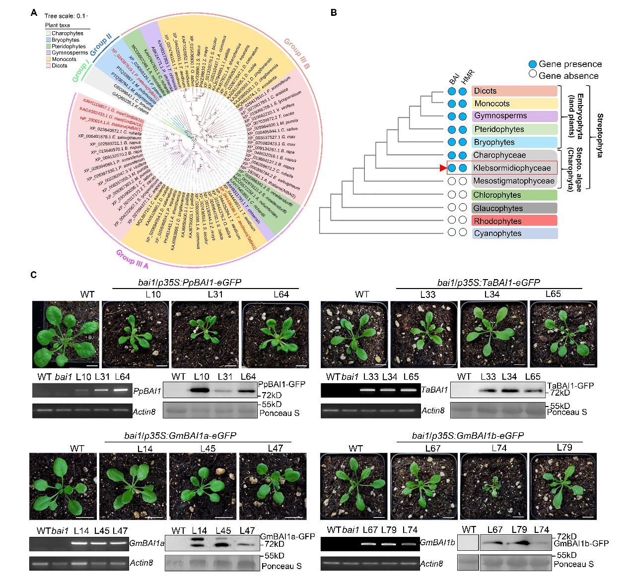 通过拟南芥BAI1蛋白同源比对发现,BAI1家族为植物特有,最早出现在克里藻(Klebsormidium nitens)中,而在原核蓝藻、单细胞真核衣藻、小球藻与动物中均未发现。系统进化分析表明,BAI1和HMR都起源于轮藻(Charophyta)和有胚植物(Embryophyta)的共同祖先克里藻,在植物陆生化过程中遵循保守的进化路径。进一步研究发现,单子叶植物小麦和双子叶植物大豆中的AtBAI1同源基因TaBAI1、GmBAI1a和GmBAI1b能够完全恢复拟南芥bai1突变体的缺陷,而小立碗藓PpBAI1仅能部分回补bai1突变体表型(图2)。这些结果表明,BAI1基因家族在陆生植物中功能逐渐强化。