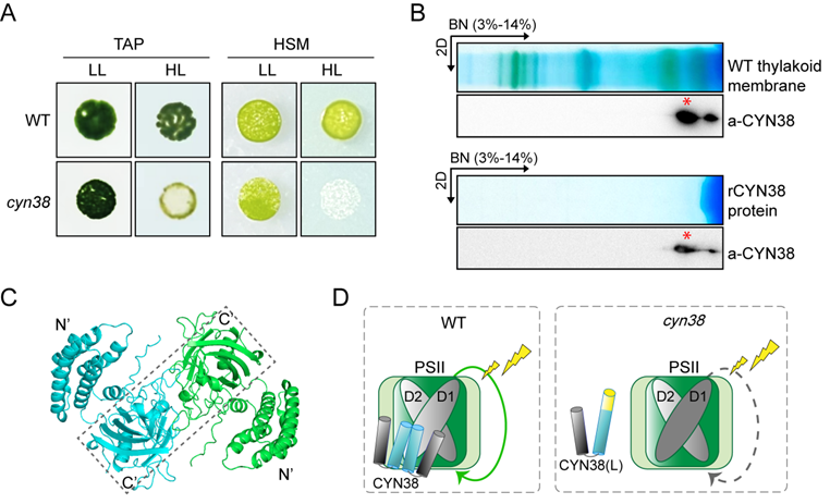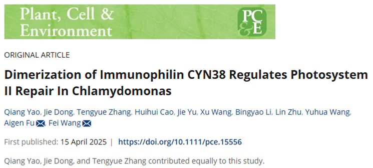 植物和藻类等光合生物通过光合作用将光能转化为化学能,是生物质能源生产的生物学基础。强光胁迫产生的活性氧分子对光合系统造成损伤,大大降低光合效率。光系统II(PSII)位于光合电子传递链的首要位置,其在强光下的有效修复决定了光合作用的稳定运行。西北大学付爱根教授领衔的植物分子生物学团队长期围绕光合生物的强光逆境响应机制开展深入研究,并取得一系列重要进展,发掘出多种参与光系统II组装修复的调节因子(Fu et al., 2007; Fu et al., 2023; Guo et al., 2024; Dong et al., 2024)。近日,该团队在中科院一区TOP期刊Plant, Cell & Environment在线发表了一篇题为“Dimerization of immunophilin CYN38 regulates Photosystem II repair in Chlamydomonas”的研究论文,报道了莱茵衣藻亲免蛋白CYN38通过二聚化调节光系统II修复的分子机制。