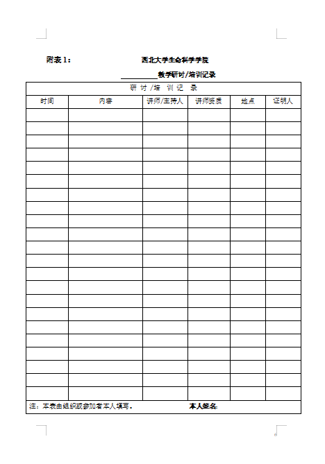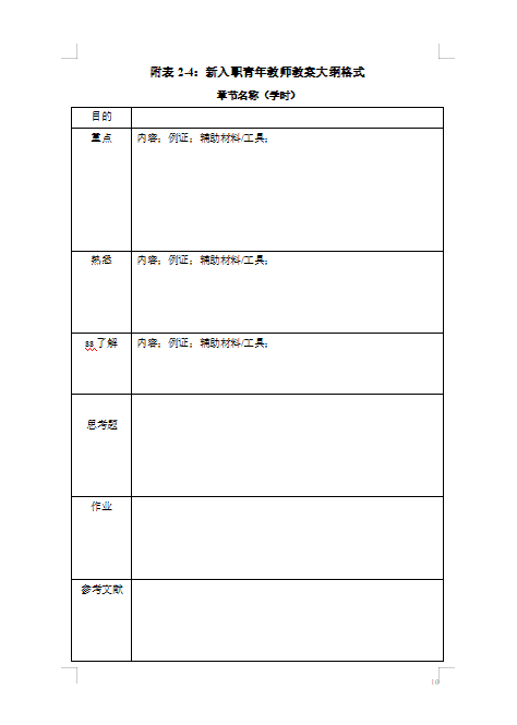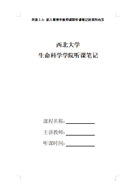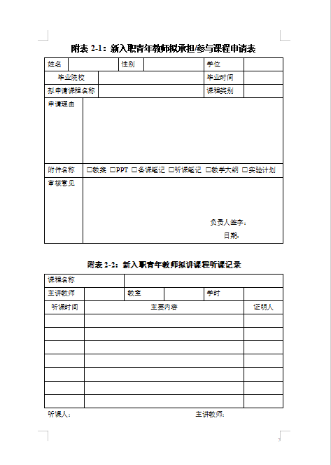 1.在培训期内,青年教师应跟随主讲教师,至少完整听过一轮拟讲授课程,并在听课结束时,向课程小组提交本人撰写的课程教案、听课记录、听课笔记、试题库试题,本人制作的相应课件,指导教师对其听课过程及参与教学辅助工作的评价等教学资料。