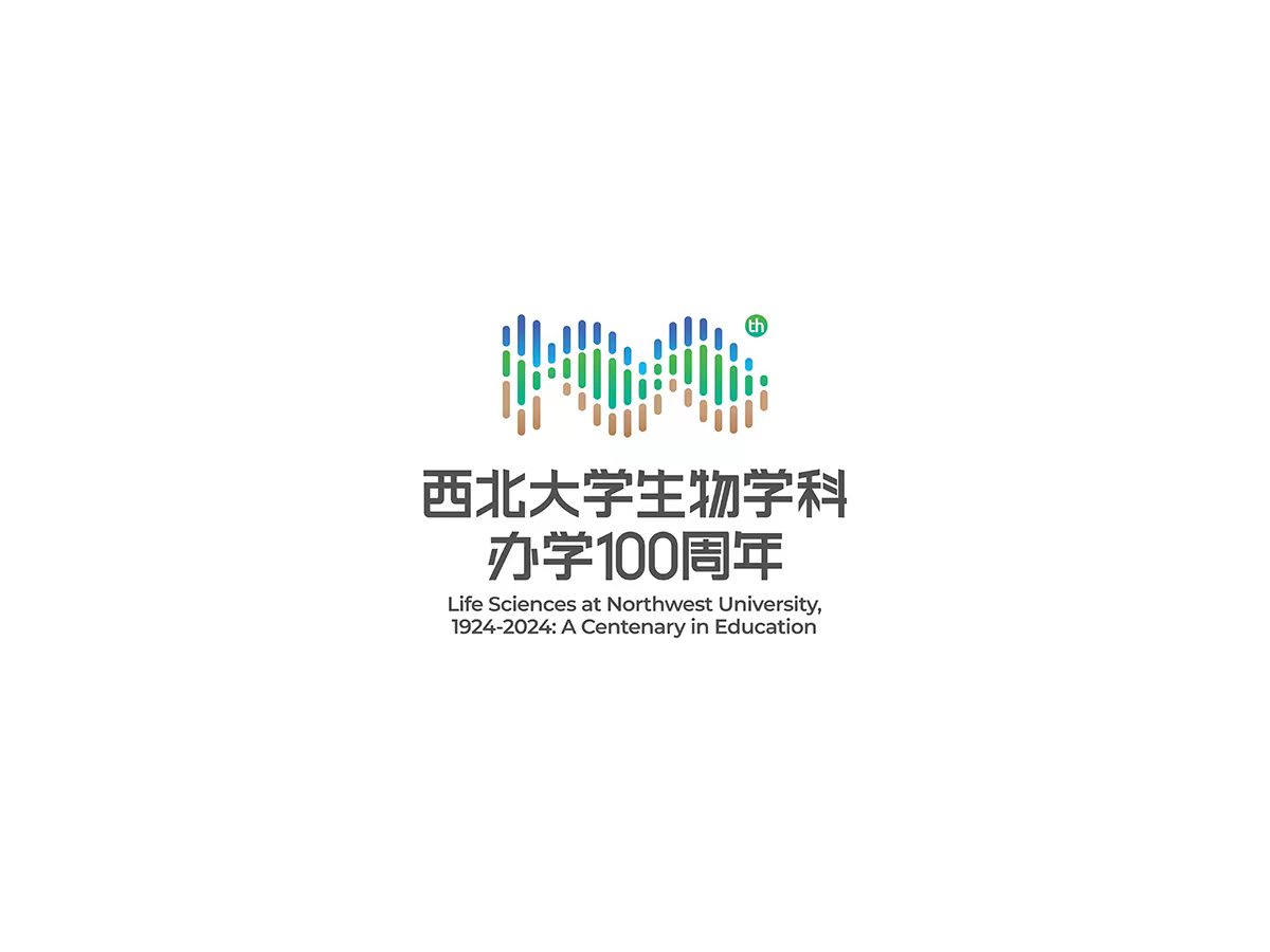 象征生物学科的抽象DNA双螺旋结构精妙的组成了数字100的具象视觉,直观表述了西北大学生物学科走过100年的办学历程。标志整体外形由三层序列图形组成,第一层金黄色,代表着深厚的教育积淀与底蕴,为优秀的人才提供丰沃的教育土壤;第二层绿色,是带着对生命科学的敬意,在探索与精研中不断成长;第三层蓝色,是蓝色的天空,是同频科学技术属性的表达,也是美好环境哺育下的时代向往。