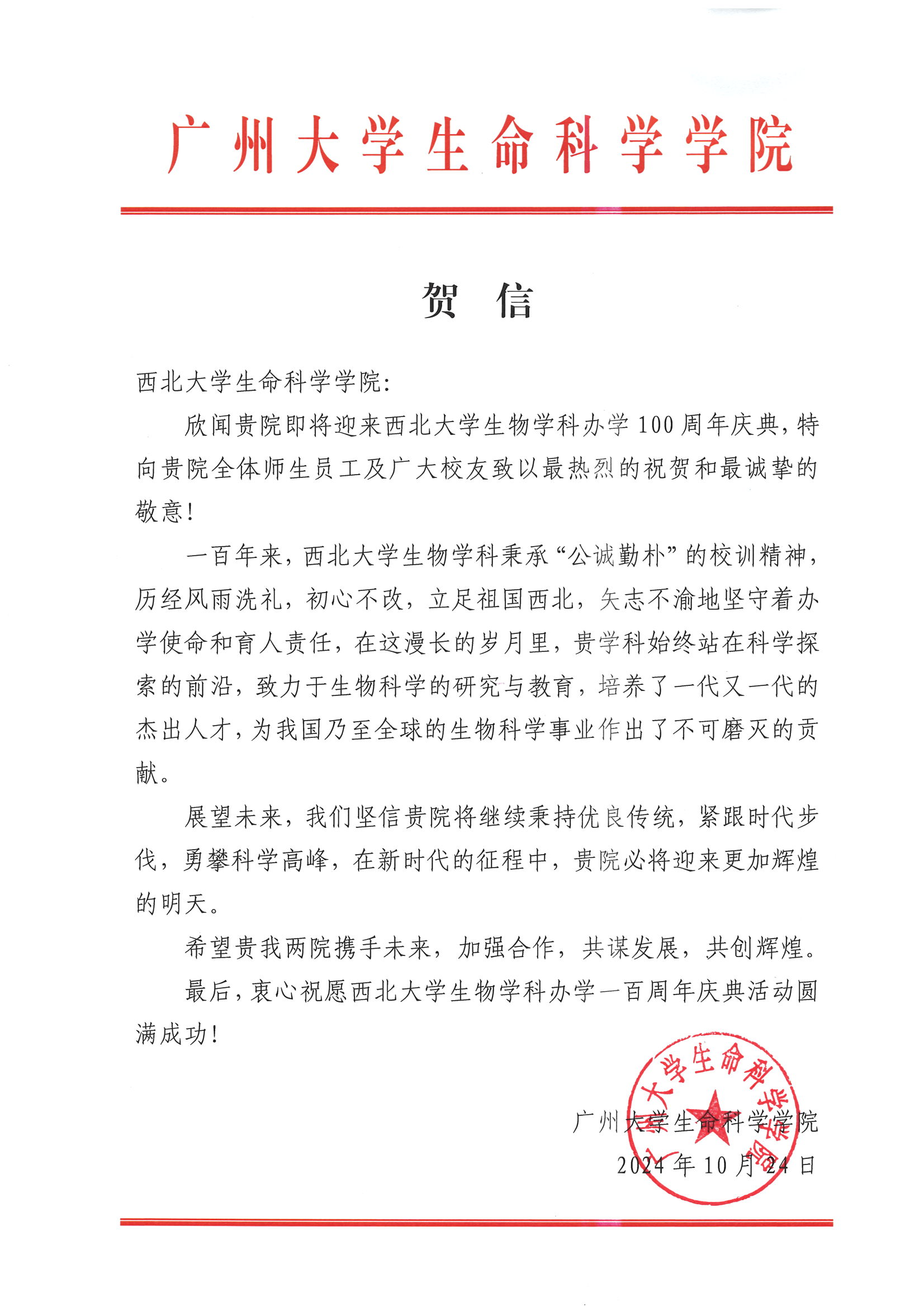 广州大学生命科学学院贺信