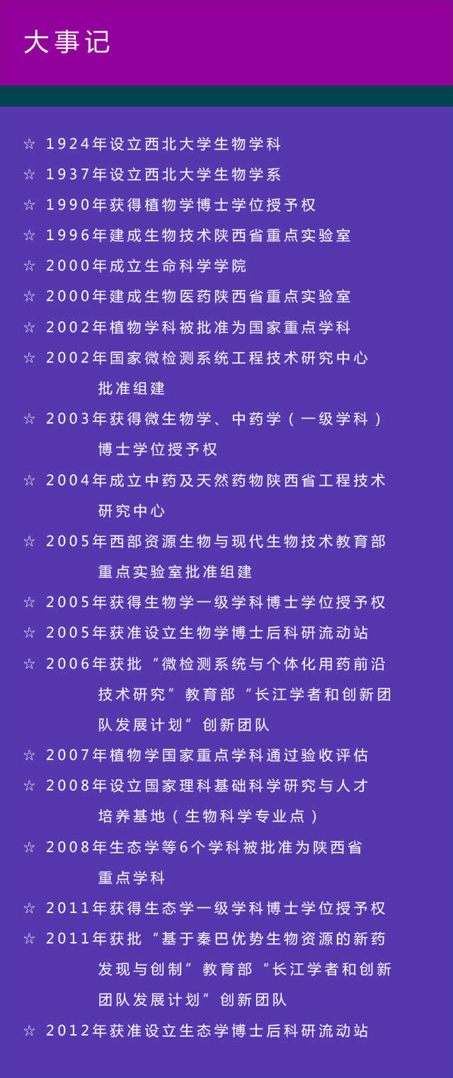 西北大学生物学科创建于1924年,是全国较早建立生物学科的高等院校之一,2000年组建为生命科学学院。近百年来,西北大学生物学科培养了包括阎隆飞院士,原中科院植物所所长路安民,国家杰青任海云、袁明、朱瑞良、孔宏智、王磊,华大基因原 CEO 杨爽等杰出生物学人才,是西北地区培养生命科学与技术高层次人才的重要基地。